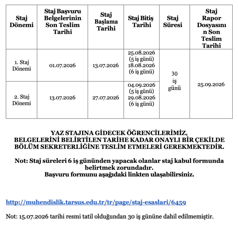 2025-2026 Eğitim Öğretim Yılı Staj Takvimi Hk.