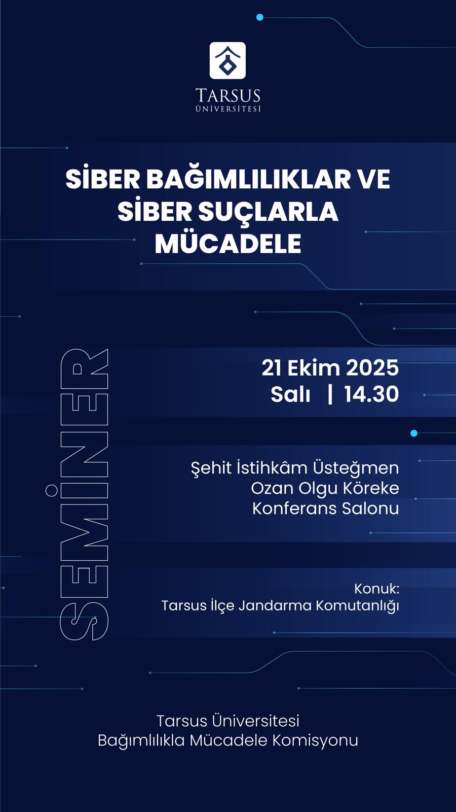 Tarsus Üniversitesi Bağımlılıkla Mücadele Komisyonu tarafından “Siber Bağımlılıklar ve Siber Suçlarla Mücadele” konulu seminer düzenlenecektir. Öğrencilerimizin bilinçlenmesi ve farkındalık düzeylerinin artırılması amacıyla düzenlenen bu etkinliğe katılımları önemle beklenmektedir.