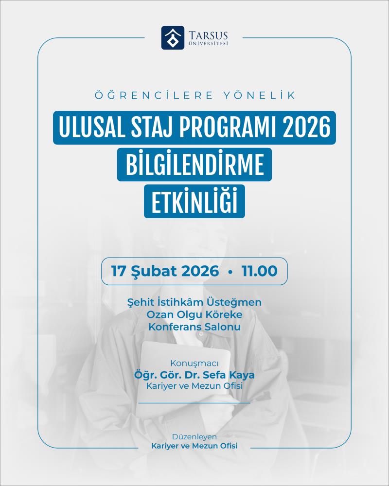 Tarsus Üniversitesi Kariyer ve Mezun Ofisi tarafından, öğrencilerimizin Ulusal Staj Programı 2026 sürecine ilişkin bilgi edinmelerini sağlamak amacıyla bilgilendirme etkinliği düzenlenecektir. Tüm öğrencilerimiz davetlidir.